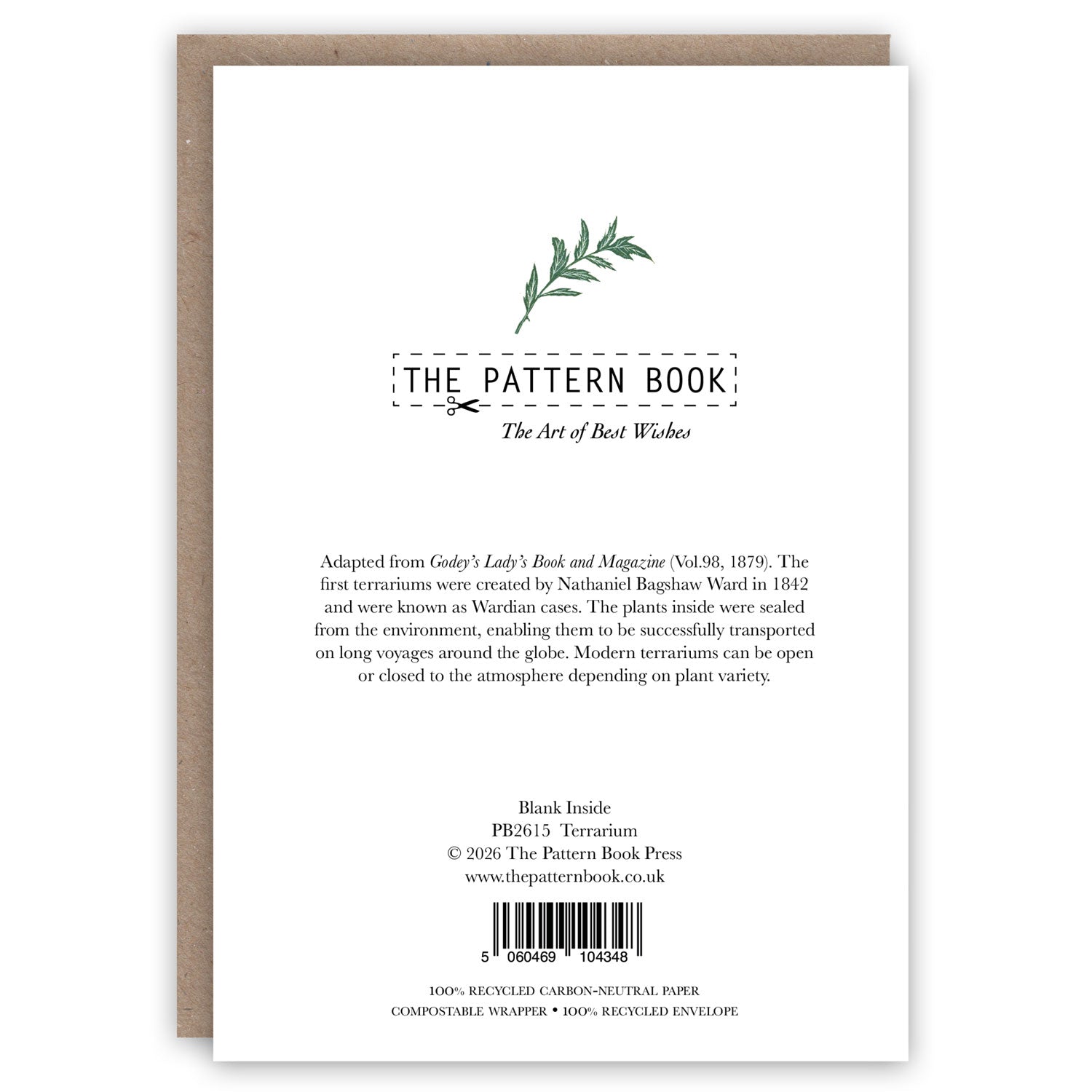 Greeting card depicting a terrarium plant case. Printed in England on a light cream, 300gsm carbon-neutral Italian paper, made from 100% recycled post-consumer waste.