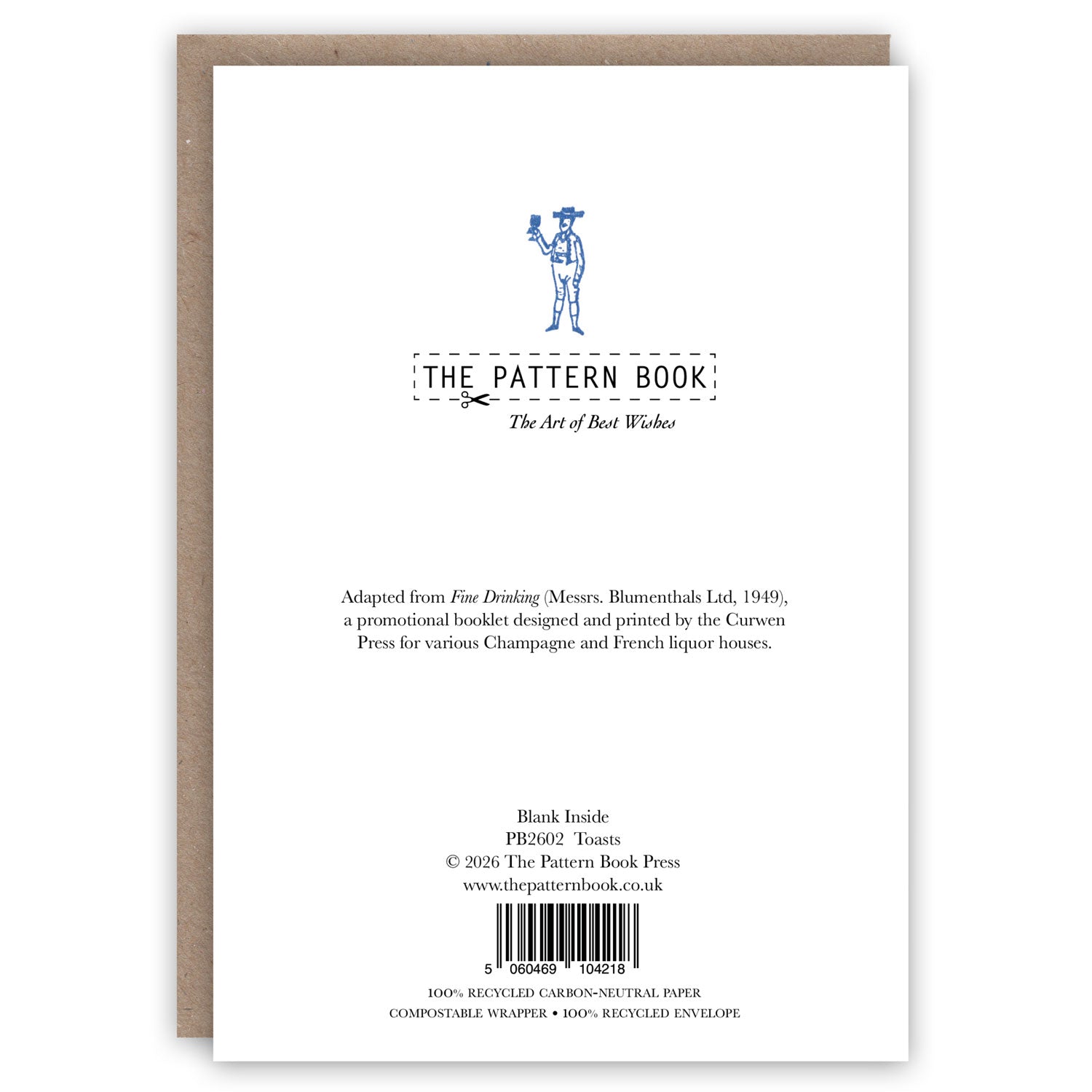 Greeting card illustrating drinking toasts made in different languages and national dress. Printed in England on a light cream, 300gsm carbon-neutral Italian paper, made from 100% recycled post-consumer waste.