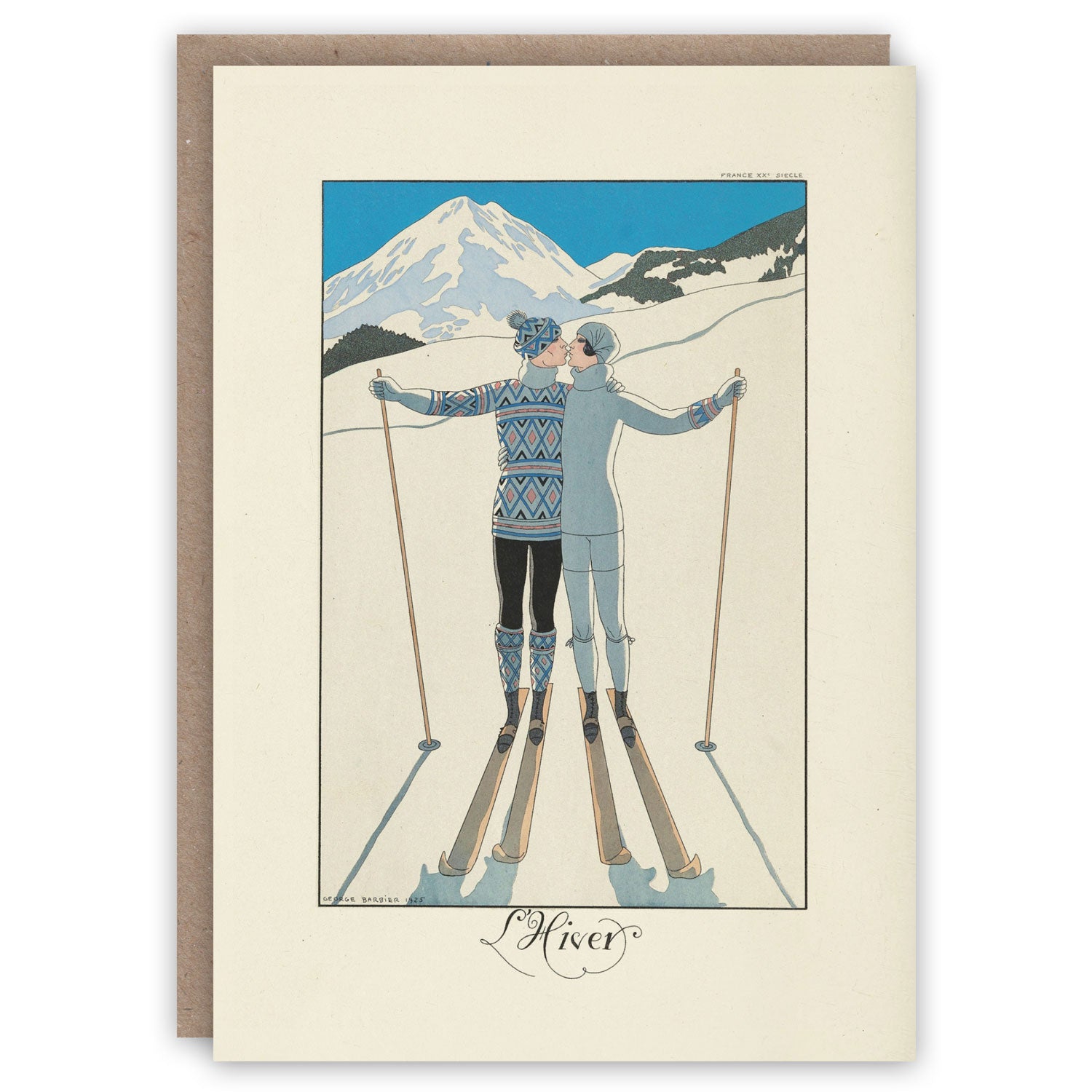 Christmas or Valentines card depicting skiers kissing on the slopes. Printed in England on a light cream, 300gsm carbon-neutral Italian paper, made from 100% recycled post-consumer waste.